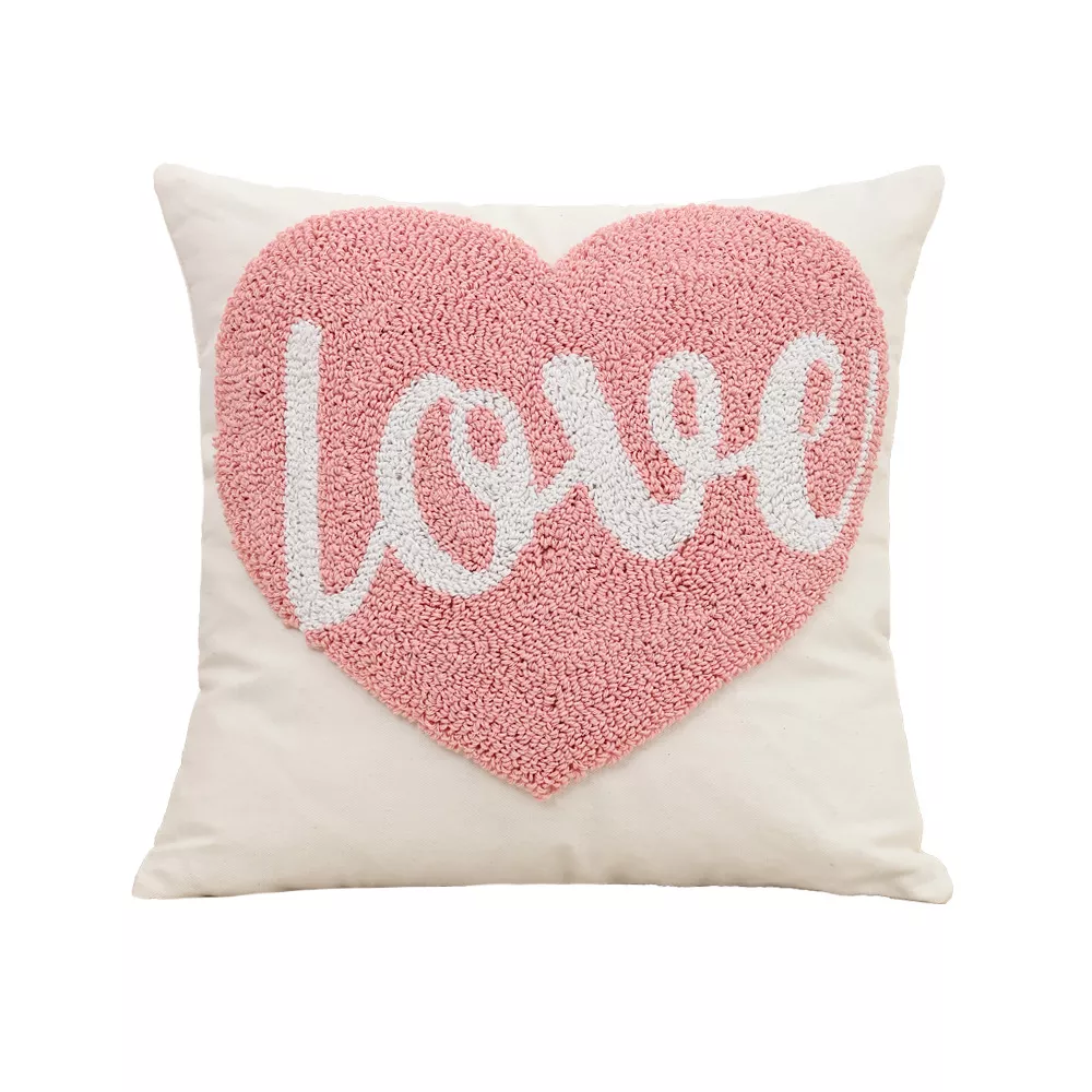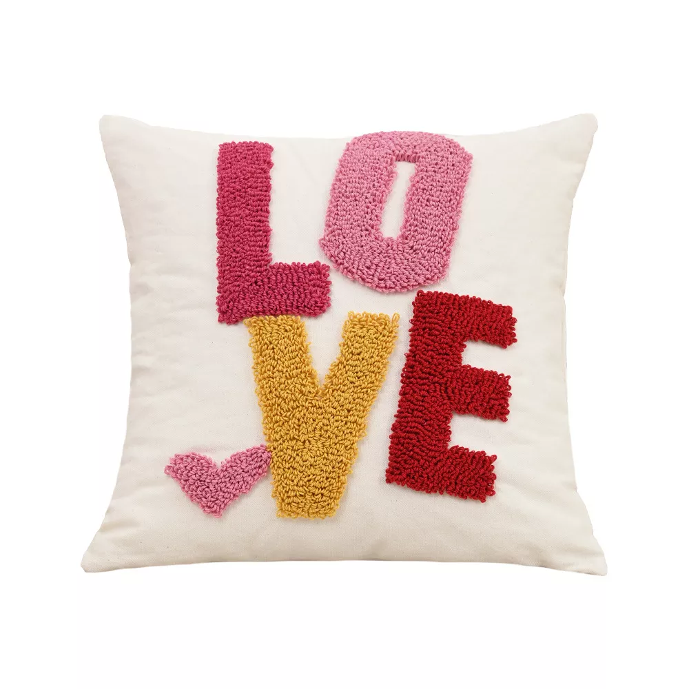 Made from a soft cotton canvas base with tufted velvet embroidery, the front showcases a textured “LOVE” design in a playful, romantic tone. The back features a clean, plain fabric that ensures versatility and comfort. Measuring approximately 18 x 18 inches, it fits standard throw pillows perfectly, making it ideal for couches, beds, reading nooks, or accent chairs.